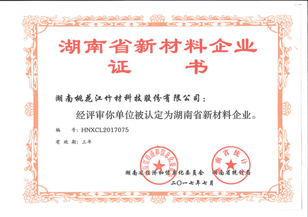2017年7月,湖南省經(jīng)濟(jì)和信息化委員會(huì)、湖南省統(tǒng)計(jì)局為湖南桃花江竹材科技股份有限公司正式頒發(fā)“湖南省新材料企業(yè)”證書(證書編號(hào):HNXCL2017075)。湖南省新材料企業(yè)的認(rèn)定,標(biāo)志著湖南桃花江竹材科技在新型竹材領(lǐng)域的成績(jī)得到國(guó)家認(rèn)可與支持,是一項(xiàng)具有含金量的突破性榮譽(yù)。作為中國(guó)竹業(yè)龍頭企業(yè),湖南桃花江竹材科技一直走在新型竹材研發(fā)、運(yùn)用和推廣的前沿,為全球竹產(chǎn)業(yè)的發(fā)展持續(xù)貢獻(xiàn)力量。