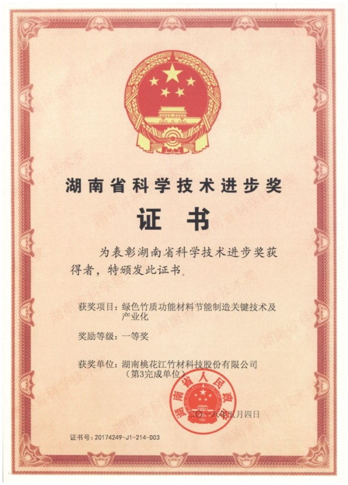 其中, 湖南桃花江竹材科技股份有限公司的綠色竹質(zhì)功能材料節(jié)能制造關(guān)鍵技術(shù)及產(chǎn)業(yè)化項目榮獲2017年湖南省科學(xué)技術(shù)進(jìn)步一等獎。